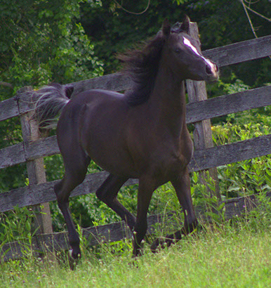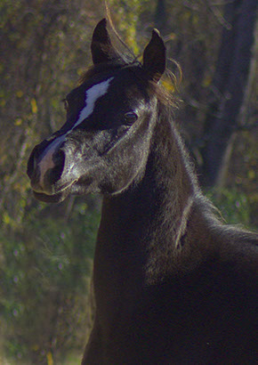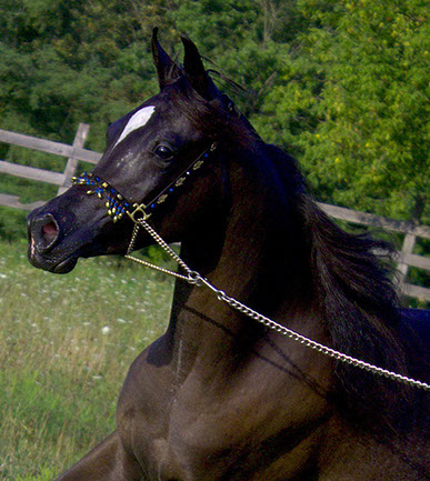 Wow! Look at the beautiful hip and shoulder on this gorgeous young boy -- and his tiny exotic head. If you are looking for an ultra flashy black colt, this is your boy! Pharaoh has a white blaze on his forehead and several white socks. Black Egyptian Arabians don't come any prettier than this! Pharaoh is the grandson of champion stallion Al Baraki. He is sired by International sire Caravaggio pma and his brothers and sisters have been exported to Asia, the Middle East, Europe and Canada. Pharaoh is SCID, CA, LFS clear through parentage.