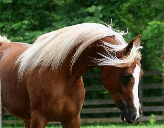 Like blondes? April is a head turning chestnut with a flaxen mane and tail -- the closest you can get to a Palomino in a purebred Arabian PLUS she's straight Egyptian, Al Khamsa and non-Minstril. This mare has an absolutely astonishing trot! April is a granddaughter of both Imperial Baarez and Shaikh Al Badi...in her you get the rare combination of these two Egyptian legends. Photo taken in July 2013.