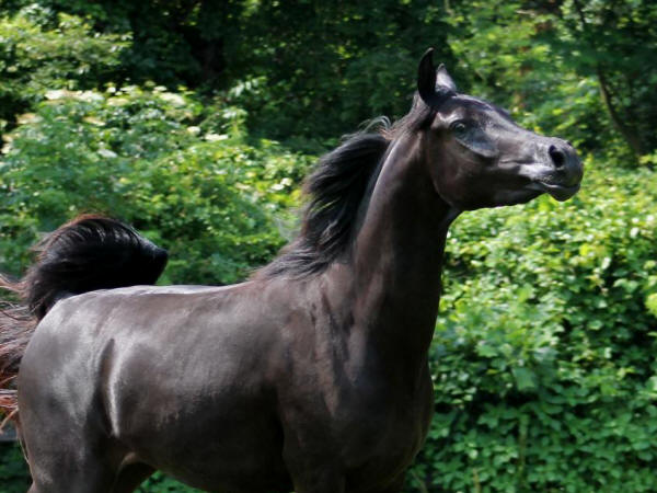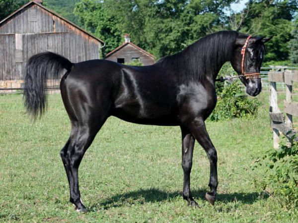 An incredible black colt! Crescent Moon has an impressive pedigree, gorgeous head and moves like a dream. Sired by a homozygous black Ashtar Dark Ali son and out of our AF Cassidy daughter. A black colt of the Obeyan strain is said to be unusual. Very correct with a wonderful neck set, short back and balanced body. Homozygous black, too! Yearling photo taken in August 2011.
