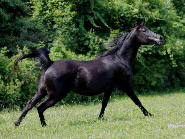 Hazarah is a pure in strain homozygous black daughter of Haziz Halim! She is Al Khamsa, has a large soft eye, nice neck and THE most astonishing TROT. She can help your breeding program by bringing some movement and a topline into the foals she produces. Hazarah is a sweet mare that is easy to handle and is a loving mother to her foals.