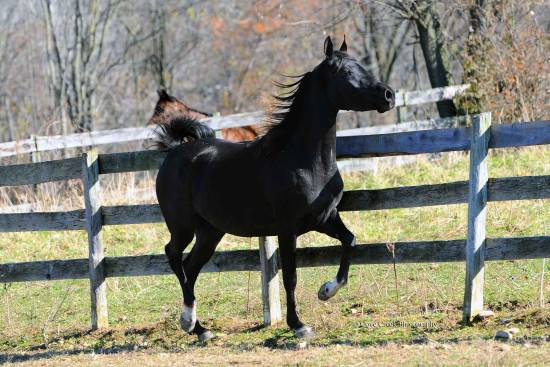 Rapture is a daughter of the black Magnum Psyche son PFC Trevallon and her dam is a black Egyptian bred mare by the Almawardy son Almadinn. Her sire Trevallon has been sold and is no longer standing in the United States. She is in foal to our black straight Egyptian stallion Caravaggio PMA for a 2013 black Egyptian related foal. We are now regretfully offering this beautiful mare for sale in order to concentrate more on our straight Egyptian program. Trotting photo of Rapture taken mid-December 2011.