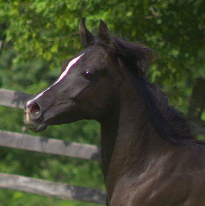 Wow! Look at the beautiful hip and shoulder on this gorgeous young boy -- and his tiny exotic head. If you are looking for an ultra flashy black colt, this is your boy! Pharaoh has a white blaze on his forehead and several white socks. Black Egyptian Arabians don't come any prettier than this! Pharaoh is the grandson of champion stallion Al Baraki. He is sired by International sire Caravaggio pma and his brothers and sisters have been exported to Asia, the Middle East, Europe and Canada. Pharaoh is SCID, CA, LFS clear through parentage.