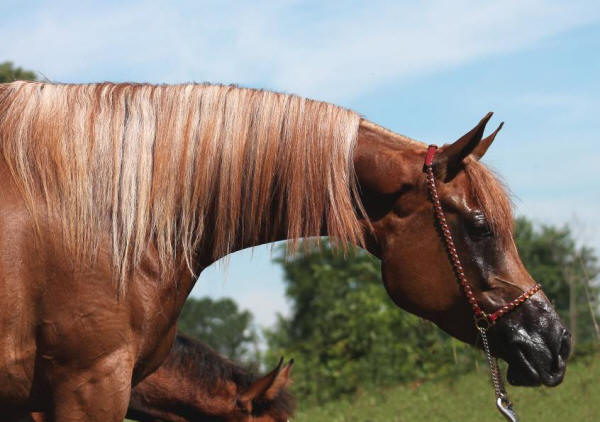 Like blondes? April is a head turning chestnut with a flaxen mane and tail -- the closest you can get to a Palomino in a purebred Arabian PLUS she's straight Egyptian, Al Khamsa and non-Minstril. This mare has an absolutely astonishing trot! April is a granddaughter of both Imperial Baarez and Shaikh Al Badi...in her you get the rare combination of these two Egyptian legends. Photo taken in July 2013.