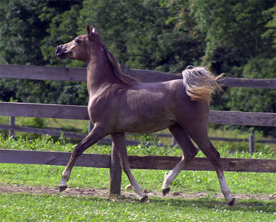 Sired by a black son of Ashtar Dark Ali, this lovely two year old mare is capable of producing black fifty percent of the time when bred to a homozygous black stallion. Cressida is a wonderfully solid filly with a beautiful head and that "look at me" attitude! She is a powerfully built mare, note her low set hocks which makes her a top performance candidate. Substance, beauty, femininity and refinement...all in one! Carries a lot of the Egyptian Babson blood, too. Photo taken Fall of 2012.